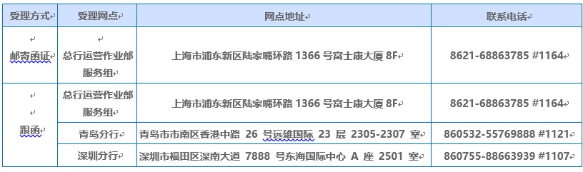 尊敬的客户: 根据《关于加快推进银行函证规范化、集约化、数字化建设的通知》(财会〔2022〕39号)、《财政部办公厅金融监管总局办公厅关于印发<银行函证工作操作指引>的通知》(财办会〔2024〕2号,以下简称“《操作指引》”)要求,现将我行询证函业务受理相关事项公告如下: 一、受理方式 目前我行询证函受理方式为邮寄函证和跟函两种。 1、若以邮寄方式办理询证函业务,请将函证统一寄送至总行运营作业部服务组; 2、若以跟函方式办理询证函业务,请携加盖会计师事务所公章的介绍信(正本)和会计师事务所经办人员身份证原件前往各分行网点交办。 二、网点信息 我行询证函业务受理网点信息详见下表: